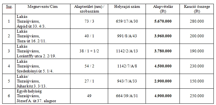 A Tiszaújváros Polgármesteri Hivatala értékesítésre meghirdeti az önkormányzat tulajdonában lévő alábbi üres társasházi lakás- és helyiség ingatlanokat:.